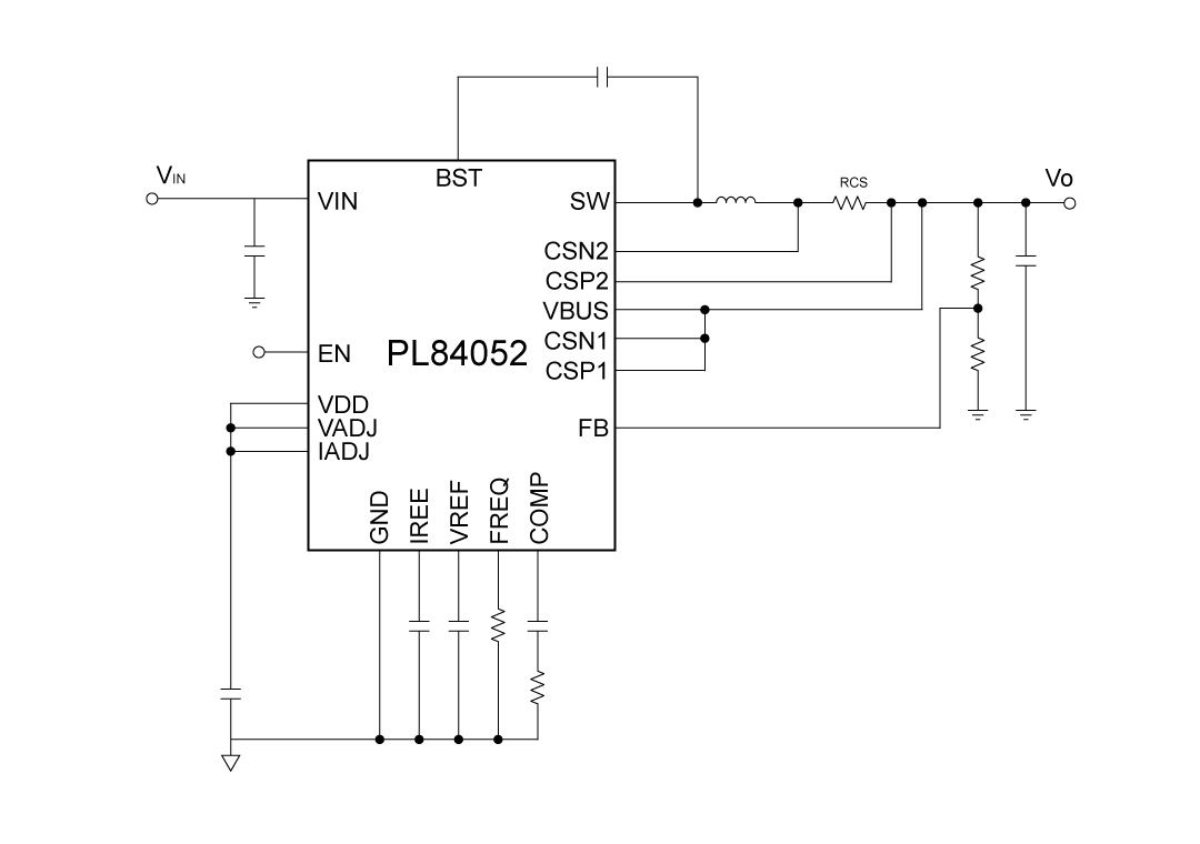 PL84052是一個款PWM(脈寬調制解調)有有節制器,目的在于中用轉換線電壓為4.2V到24V的高功能搜集減壓 DC-DC 支配。PL84052得到勻速運動揭開時有有節制。依照規定FREQ引腳和GND引腳中間的相差電容值,開關按鈕頻度夠設備為150kHz或300kHz。該裝備還具備可編程的軟啟動功效,并供給各類掩護特征,包含周期性電流限定、輸出欠壓鎖定(UVLO)、輸出過壓掩護(OVP)、熱關斷和輸出短路掩護等。PL84052供給電壓節制回路、恒流回路和熱調理回路。